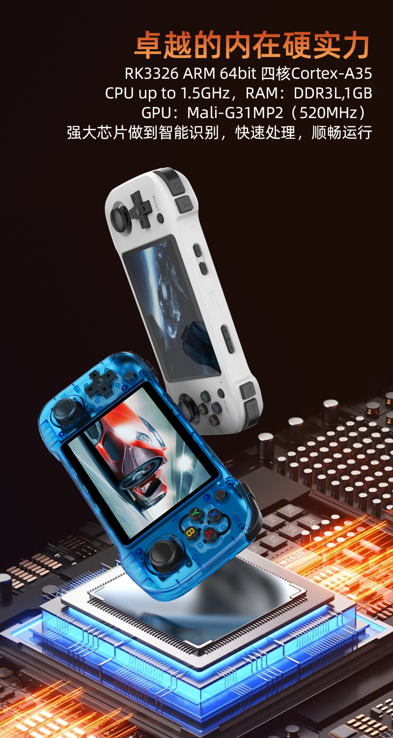 - CPU/GPU: RK3326 Quad-core Cortex-A35 @1.5GHz / Mali-G31 MP2 @520MHz